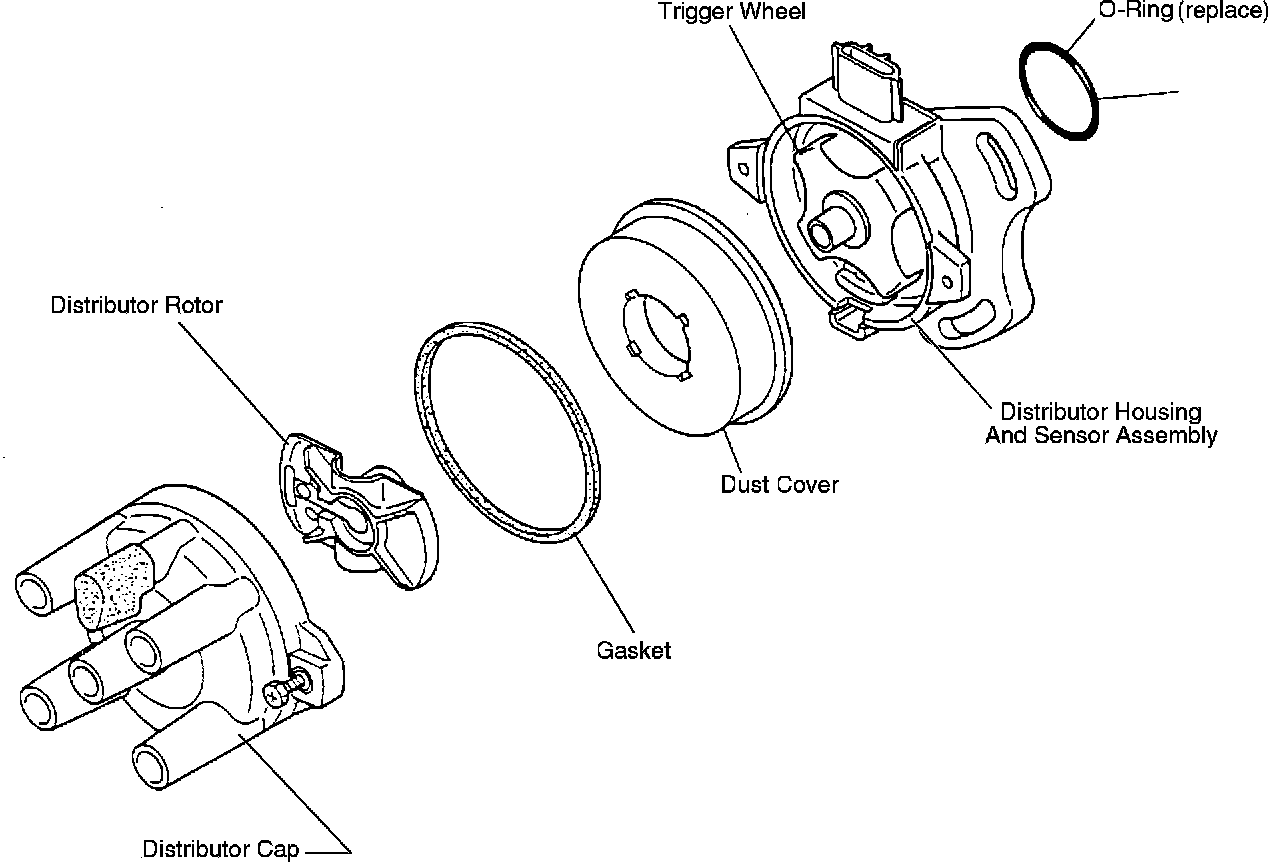 Distributor contains a trigger wheel that turns with the distributor shaft, and a stationary pick-up assembly. As the wheel rotates past the pick-up, signals are generated and interpreted by the ECU to determine crank angle (#1 cylinder TDC) and engine rpm. To calculate ignition timing, the ECU uses this input together with several others related to vehicle operating conditions. Except for the initial setting (basic distributor installed position), ignition timing is controlled by the ECU.