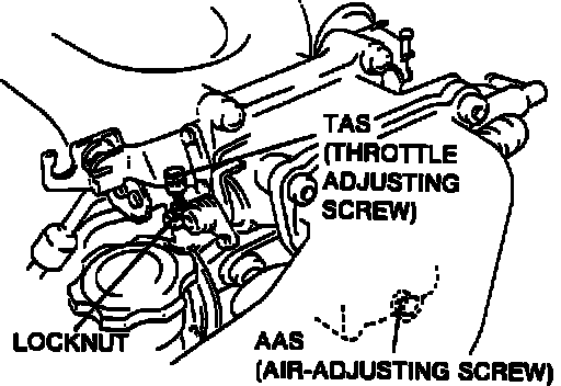 4. If not within specification when AAS is fully closed, loosen locknut and turn throttle adjusting screw (TAS) to set idle.