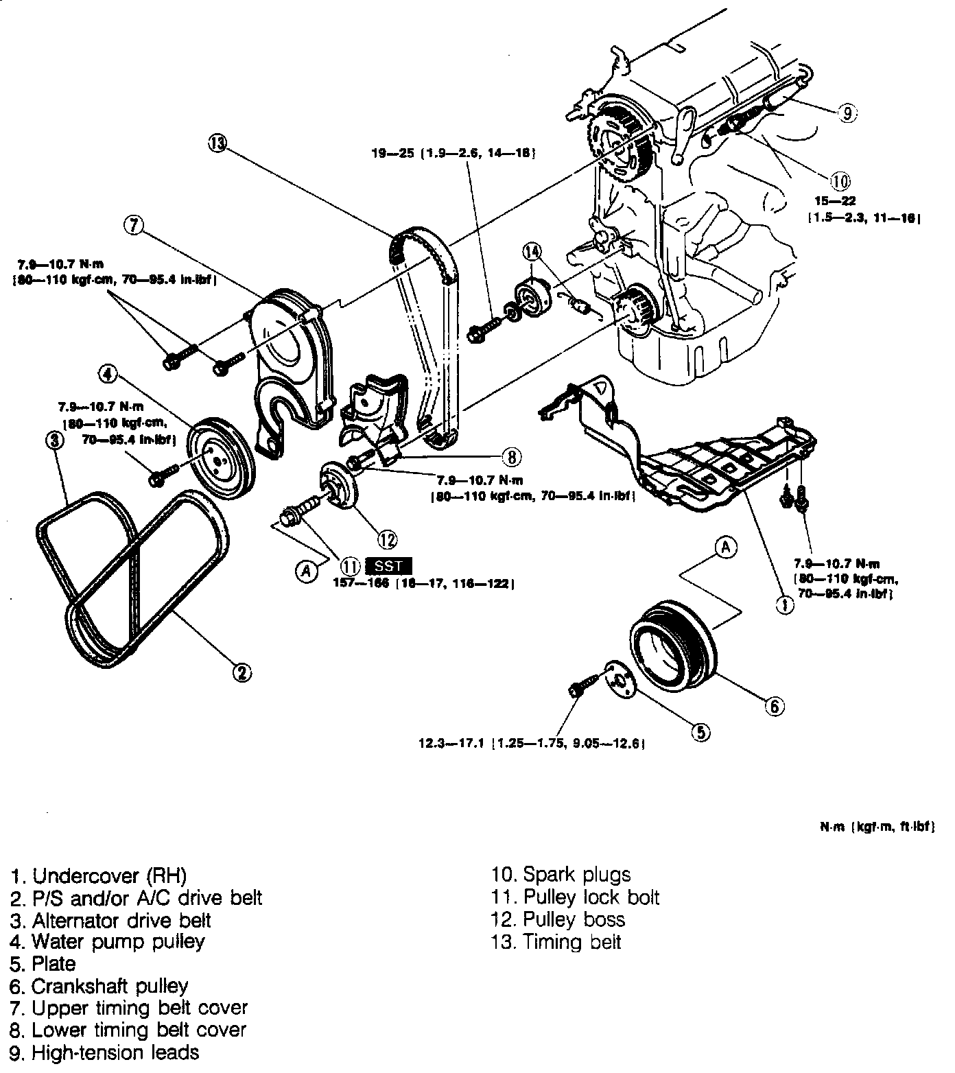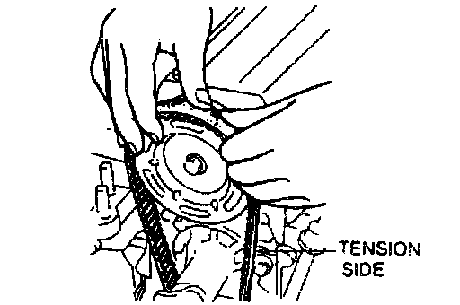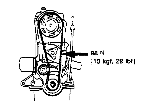 9. Check the timing belt deflection by applying moderate pressure 98 N (10 kgf, 22 lbf) midway between the timing belt pulley and the camshaft pulley. If the timing belt deflection is not correct. temporarily secure tensioner lock bolt so the spring is fully extended. Repeat steps 4-8 above or, if necessary, replace the tensioner spring.