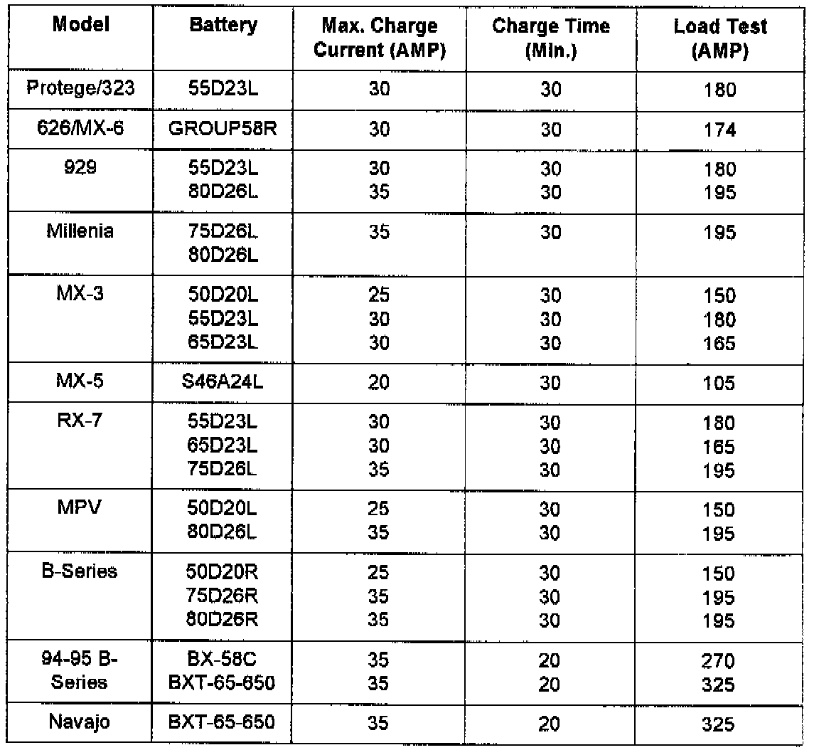 The chart gives specific charging amps times and load test amps for 1993 - '95 vehicles. Refer to the applicable workshop manual for other model year vehicles and additional troubleshooting information.
