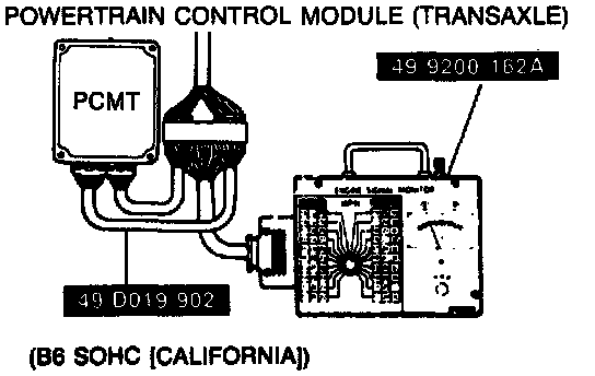 2. Connect the Engine Signal Monitor (49 9200 162A) and Adapter Harness (49 D019 902) to the powertrain control module (transaxle) as shown.