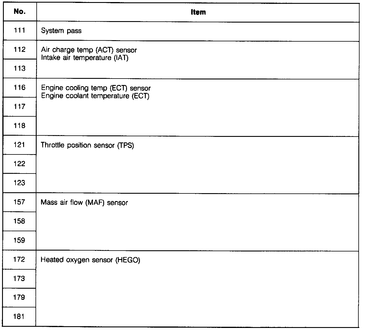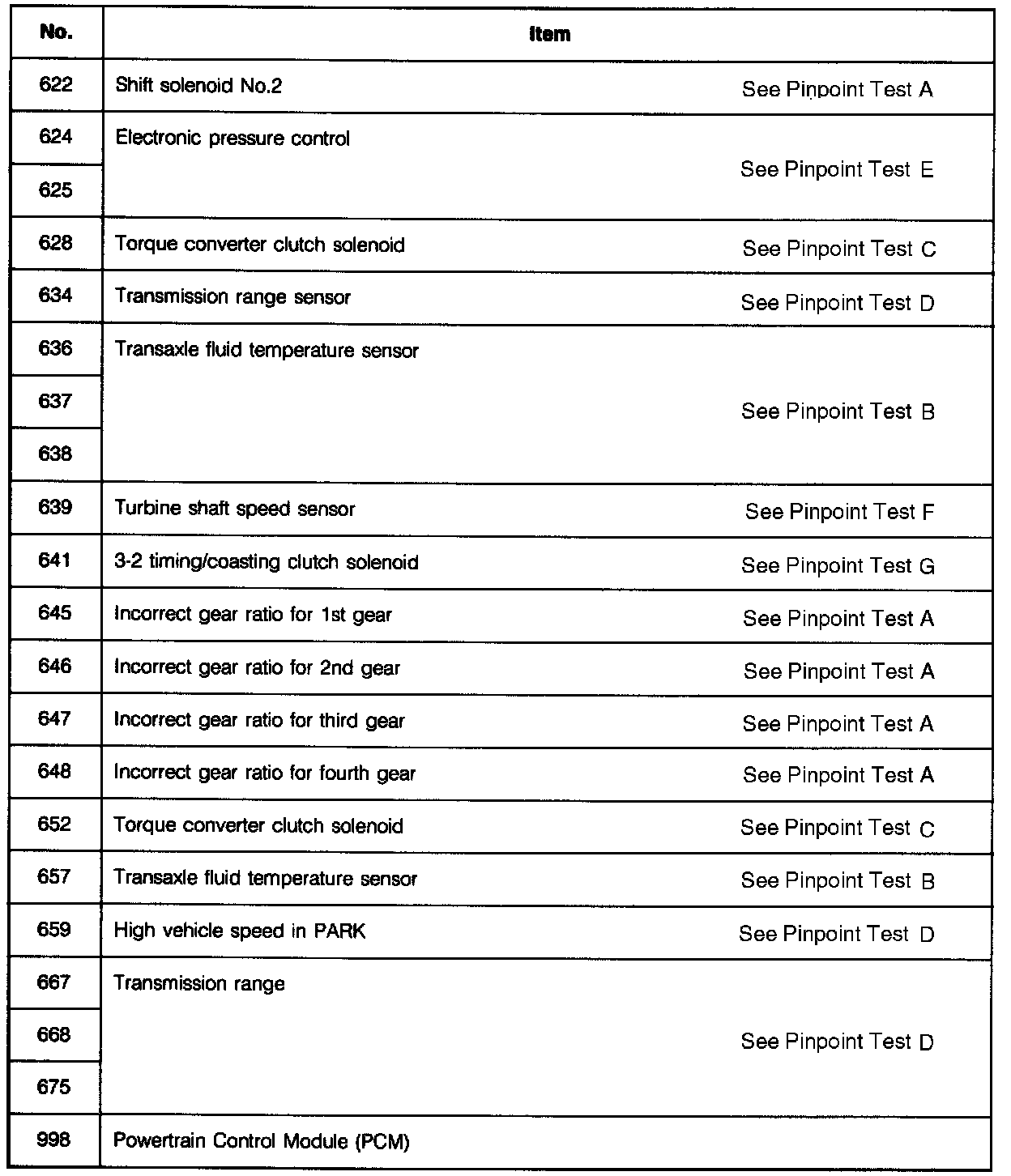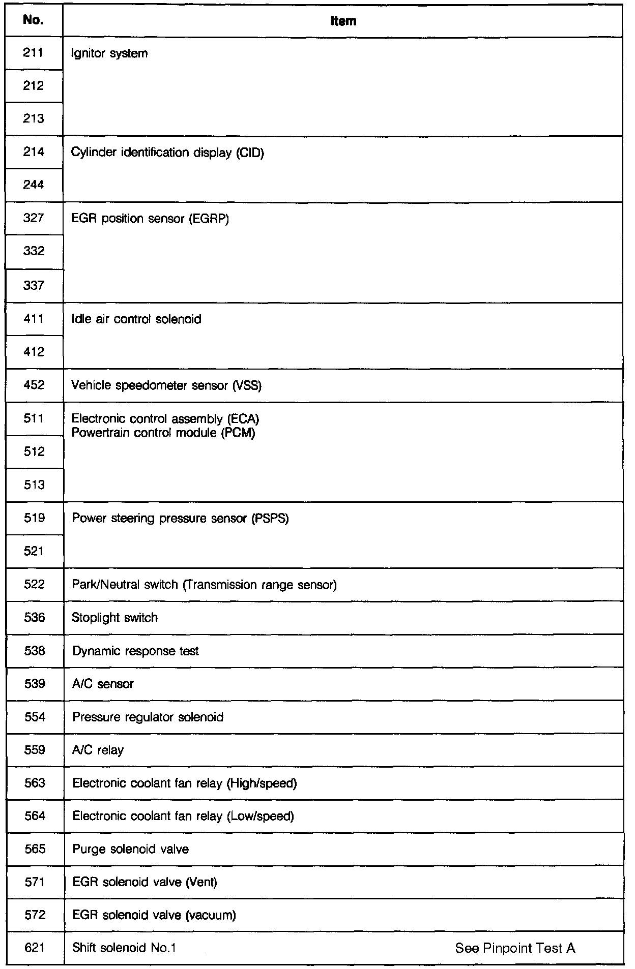 When trouble codes occur in the main input or output devices, check for the cause by using the SST. Failure of the input and output devices is indicated and retrieved from the powertrain control module (PCM) as diagnostic trouble code numbers.