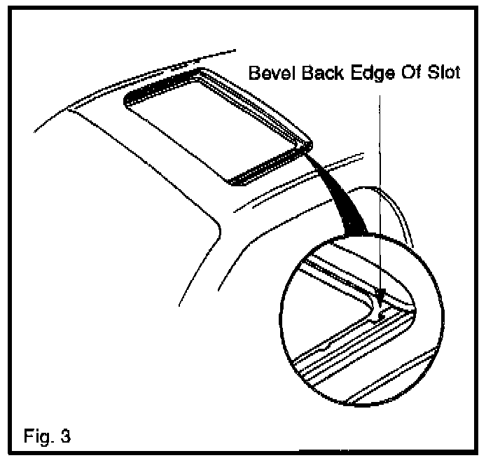 11. Using a small file, bevel the rear edge of the notch located in the sunroof frame (See Fig. 3). This will allow smoother operation of the retaining hook.