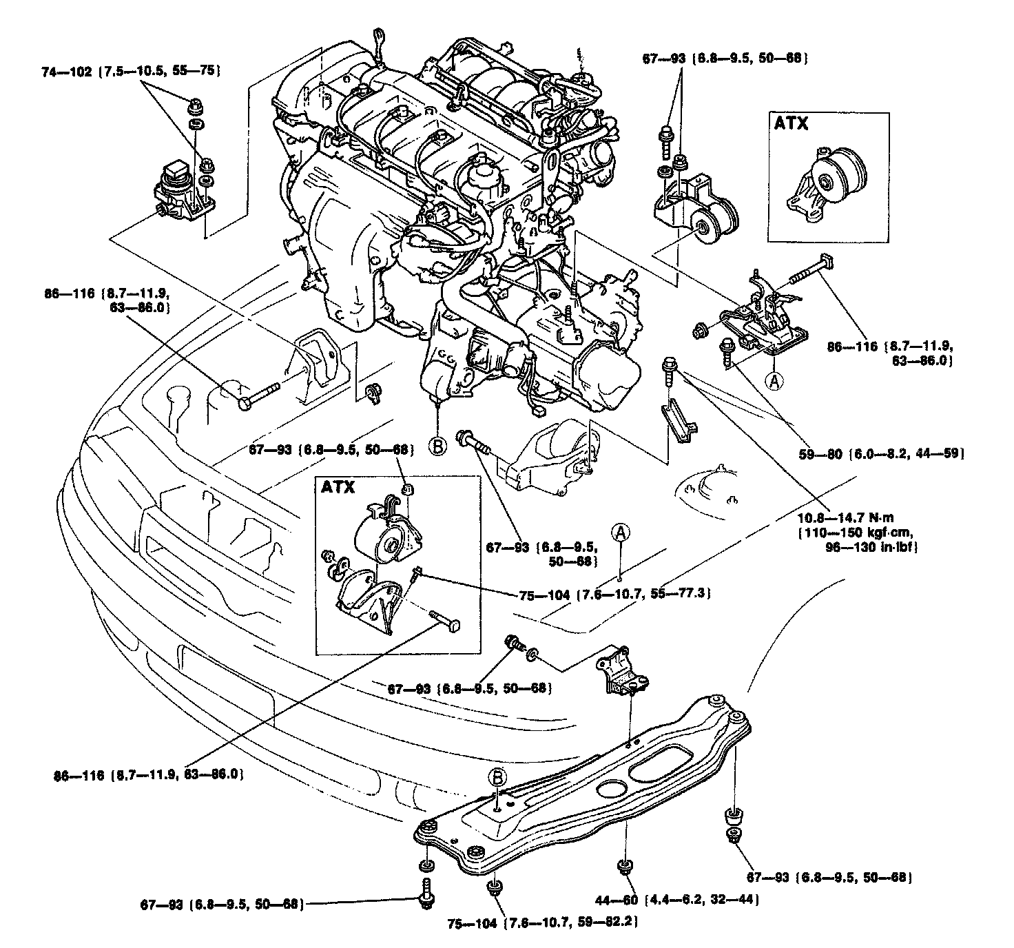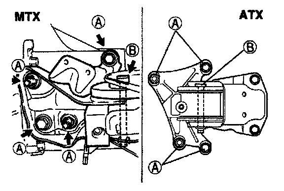9. Install the engine mount No.4 rubber. Tightening torque MTX A: 67-93 N.m (6.8-9.5 kgf.m, 50-68 ft.lbs) B: 86-116 Nm (8.7-11.9 kgf.m, 63-86 ft.lbs) ATX B: 38-51 N.m (3.8-5.3 kgf.m, 28-38 ft.lbs)
