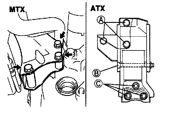 3. Install the engine mount No.1 mounting bolts. Tightening torque: MTX: 67-93 N.m (6.8-9.5 kgf.m, 50-68 ft.lbs) ATX A: 75-104 N.m (7.6-10.7 kgf.m, 59-82.2 ft.lbs) B: 86-116 N.m (8.7-11.9 kgf.m, 63-86. ft.lbs) C: 67-93 N.m (6.8-9.5 kgf.m, 50-68 ft.lbs)