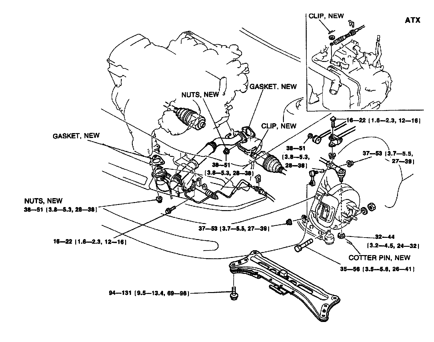 1. Install the transverse member. Tightening torque: 94-131 N.m (9.5-13.4 kgf.m, 69-96 ft.lbs)