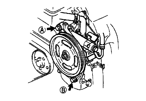 2. Install the P/S oil pump. Tightening torque: A: 44-60 N.m (4.4-6.2 kgf.m, 32-44 ft.lbs) B: 32-46 N.m (3.2-4.7 kgf.m, 24-33 ft.lbs)