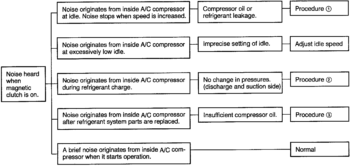 Run the engine at a constant 3,000 - 4,000 rpm; then alternately switch the A/C compressor on and off (turn the A/C switch on and off). It the noise remains, turn the ignition switch to LOCK for 1 - 2 minutes. Start the engine again, hold its speed at 3,000 - 4,000 rpm, and alternately switch the A/C compressor on and off (turn the A/C switch on and off).