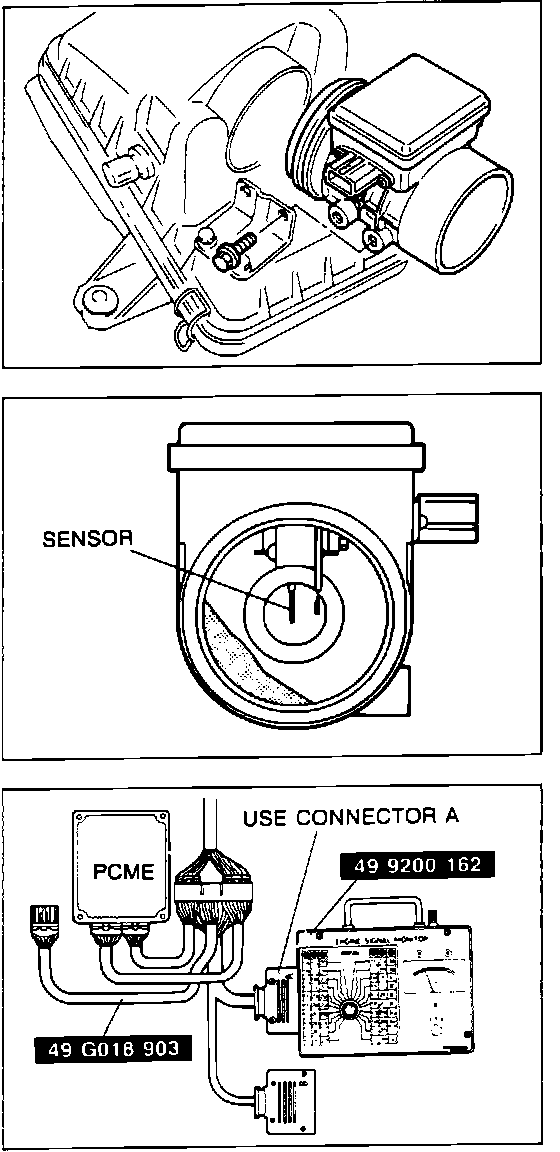 Measures volume and mass of intake air and provides signal to PCME. Unlike sensors measuring only volume, this sensor measures actual mass per unit time of air entering the engine. It is a more accurate measurement because any given volume contains different quantities of air depending on density.
