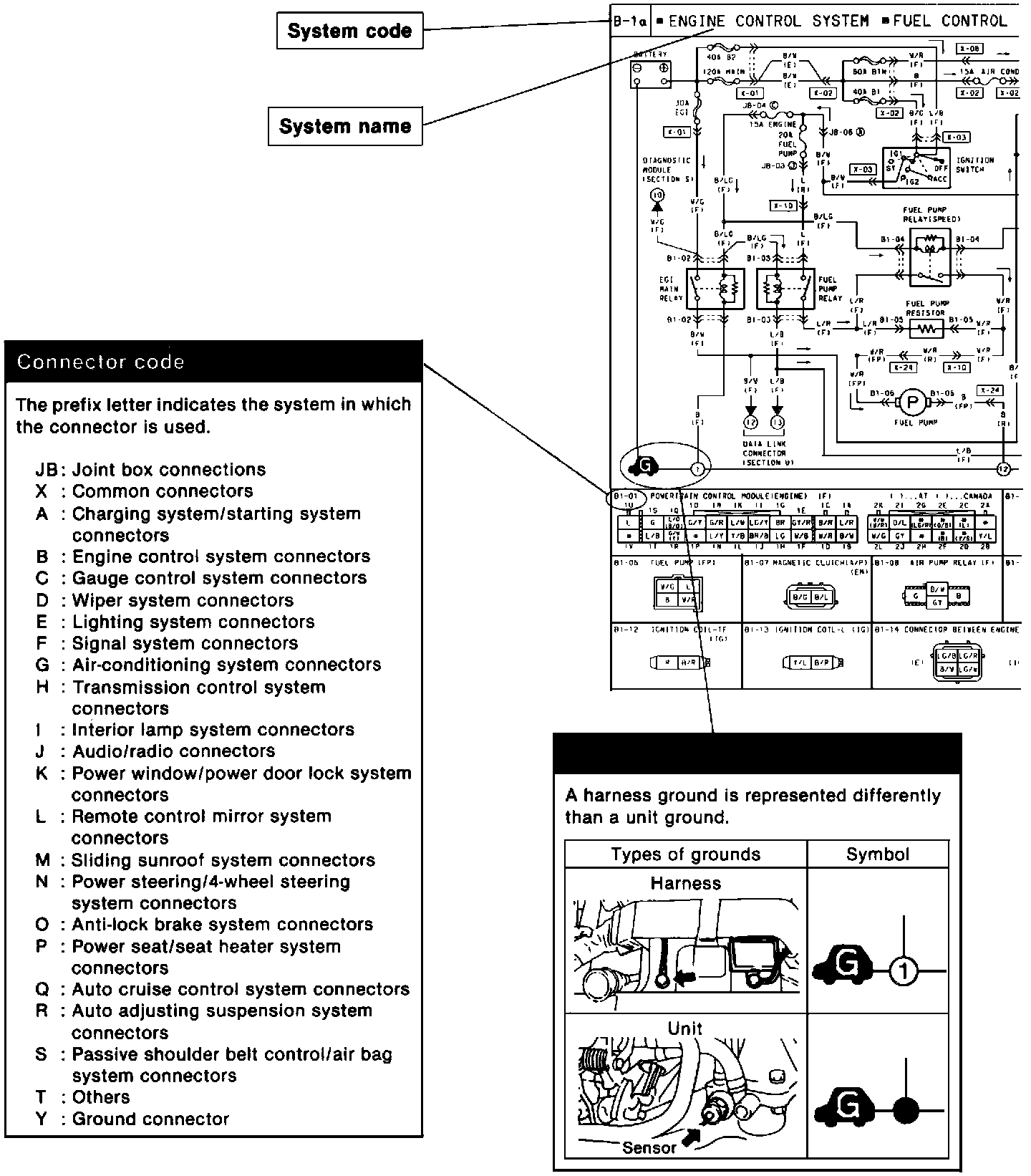 ^ These show the circuits for each system, from the power supply to the ground. The power supply side is on the upper part of the page, the ground side on the lower part. The diagrams describe circuits with the ignition switch off.