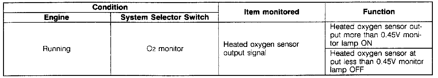 With System Selector test switch set to "02 Monitor," the heated oxygen sensor is monitored as described on image chart. For equipment hook-up, refer to Switch Monitor Function.