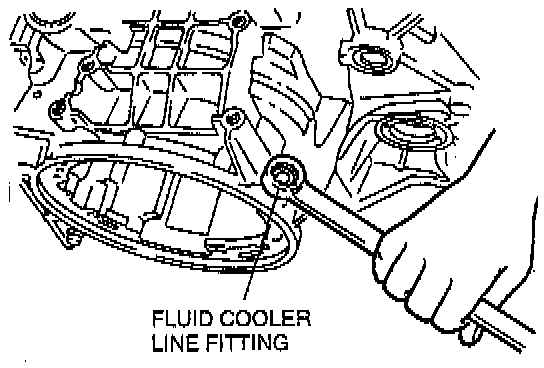 2. Apply thread sealant to the fitting. Install the fluid cooler line fitting on the transaxle case. Tighten to 40 Nm (30 ft. lbs.).