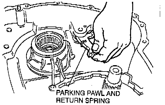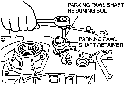 12. Install the parking pawl shaft retainer and bolt to 8 Nm (72 inch lbs.).