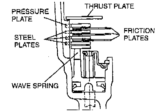 41. Remove the thrust plate, pressure plate, steel and friction plates, and the wave spring for installation later.