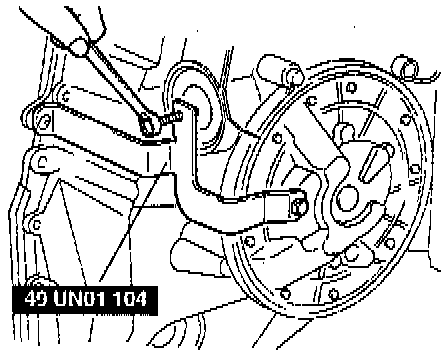 27. Remove the thermostatic oil level valve bracket bolt. Remove the bracket. Remove the filter from the forward clutch circuit.