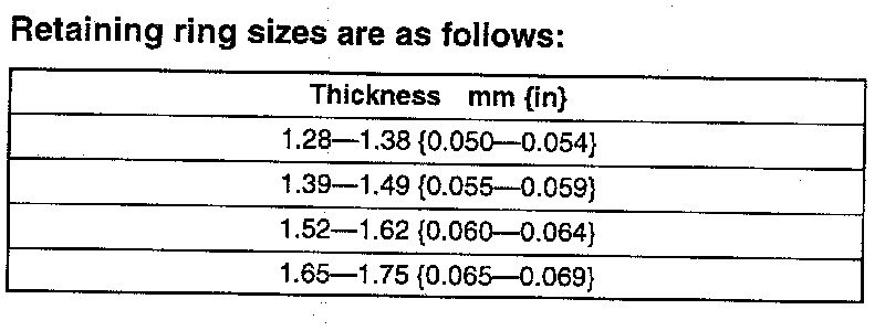 35. The standard clearance is 0.33 - 0.89 mm (0.01 - 0.04 inch). If the clearance is not within the specification, select and install the proper thickness retaining ring to obtain the standard clearance.
