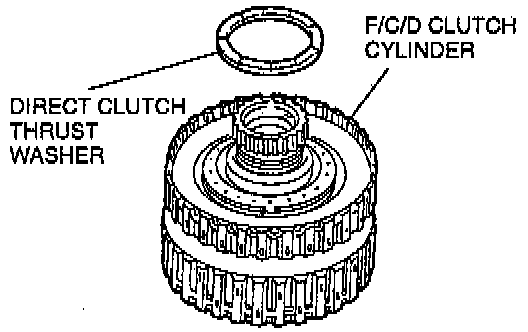 36. Install the direct clutch thrust washer on the forward/coasting/direct clutch cylinder with the tabs facing down.