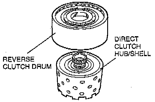 ^ Support the forward/coasting/direct clutch cylinder on a block so that the reverse clutch hub is facing up and the direct clutch hub/shell is not touching the workbench.
