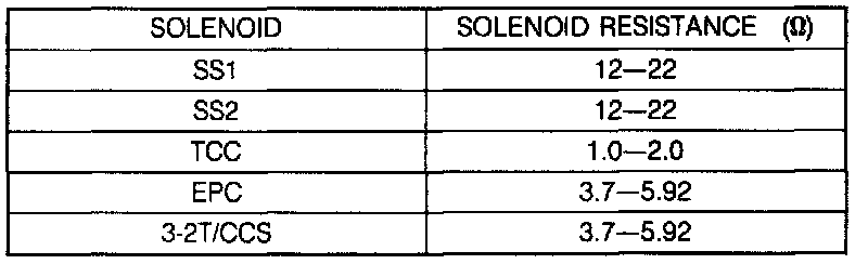 Transaxle Solenoid and Sensors Resistance Tests Solenoids (EPC, SSI, SS2, TCC, 3-2T/CCS)1. Set ohmmeter to 100-200 ohm renge.