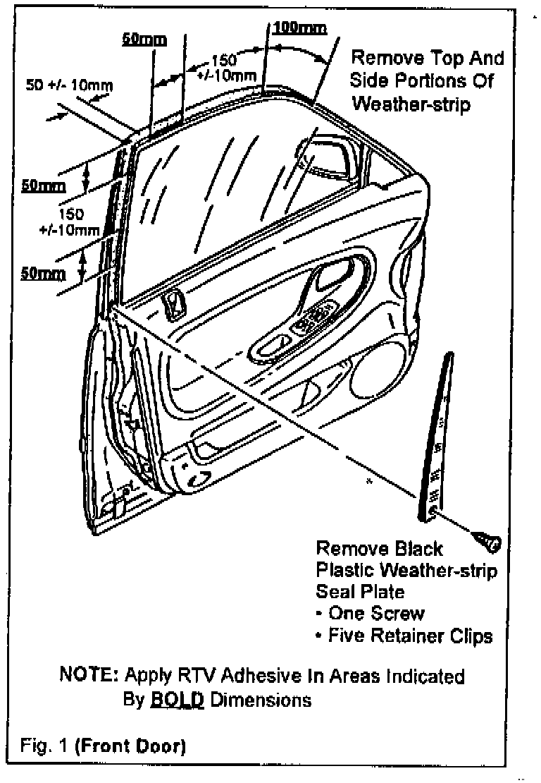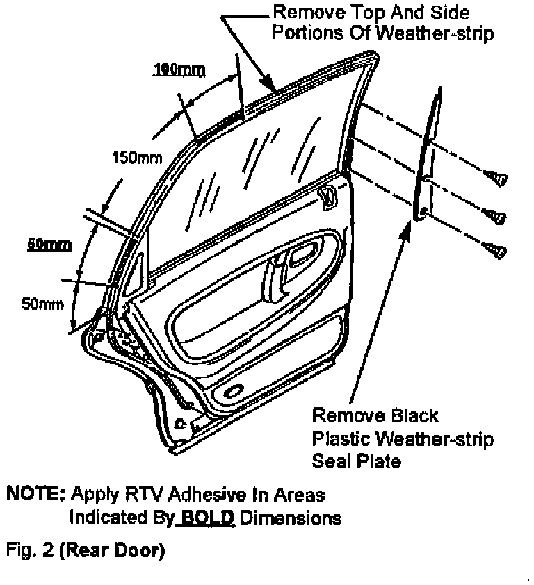 The front and rear door weather-strips can become damaged if interference exists between the weather-strip and the door sash. Damage occurs when the clearance between the sash and weather-strip is too narrow and/or when the weather-strip moves on the door frame. If there is evidence of interference and damage between the sash and weather-strip, follow the steps below for applying RTV(1) adhesive to prevent weather-strip movement.