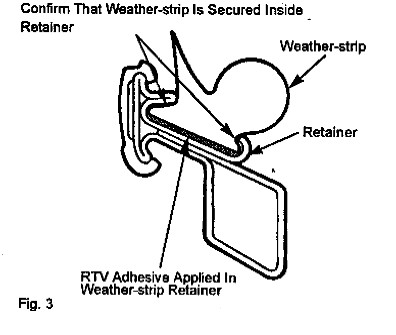 6. Install the weather-strip into the retainer and verify that the weather-strip is properly positioned in the retainer and on the door. Refer to Fig. 3