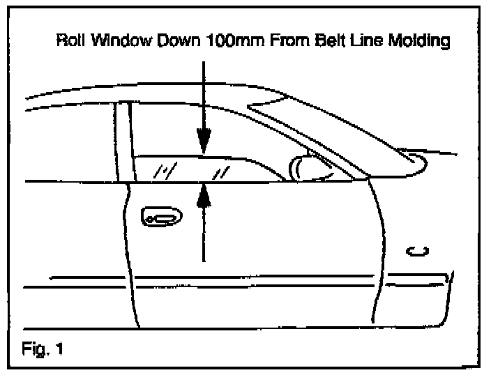 2. Roll the door glass down to 100 mm (4 in.) above the belt line molding. Refer to Fig. 1.