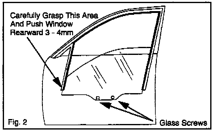 8. Pull the lower portion of the door glass run channel 3 - 4 mm (0.12 - 0.16 in.) toward the rear of the vehicle. Refer to Fig. 2.