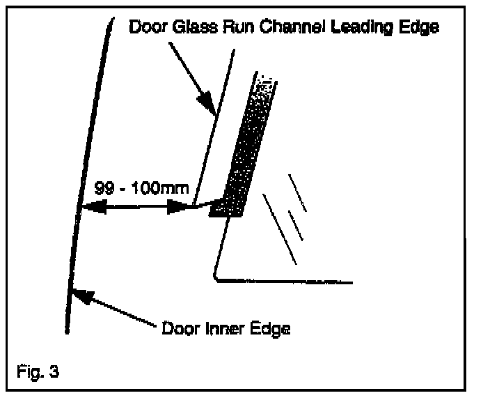 9. Measure the distance from the door inner edge to the glass run channel leading edge. The distance should be approximately 99 - 100 mm (3.90 - 3.94 in.).
