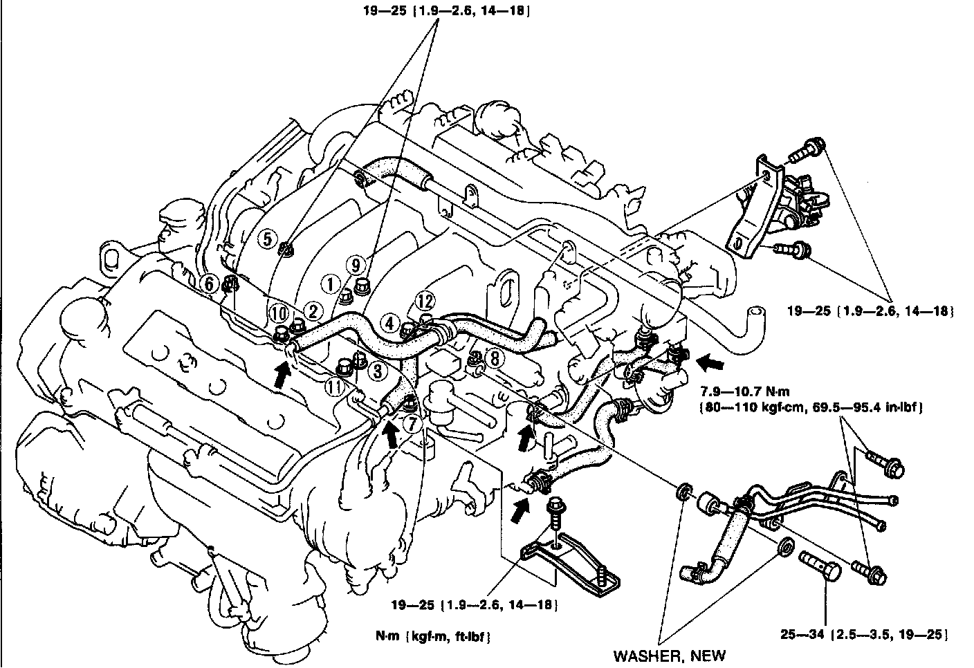 3. Tighten the intake manifold bolts and nuts in two or three steps.