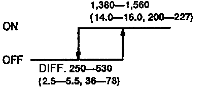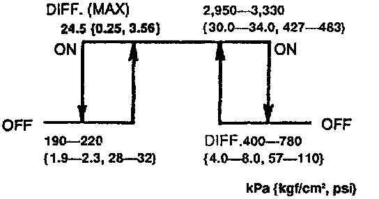 Inspection of Refrigerant Pressure SwitchIf problems occur in the refrigerant system that cause abnormally high pressure (above 2,950-3,330 kPa {30.0-34.0 kgf/cm2 427-483 psi}) or abnormally low pressure (below 190-220 kPa {1.9-2.3 kgf/cm2, 28-32 psi}), the refrigerant pressure switch will cut power to the magnetic clutch to protect the mechanical components. If the pressure recovers to within normal operating range, the power will be restored.