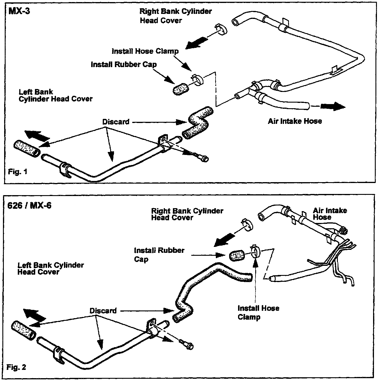 1. Discard the ventilation pipe and hose which are connected to the left bank cylinder head cover, and put the rubber cap on the end of ventilation pipe. Refer to figures 1 & 2 shown.
