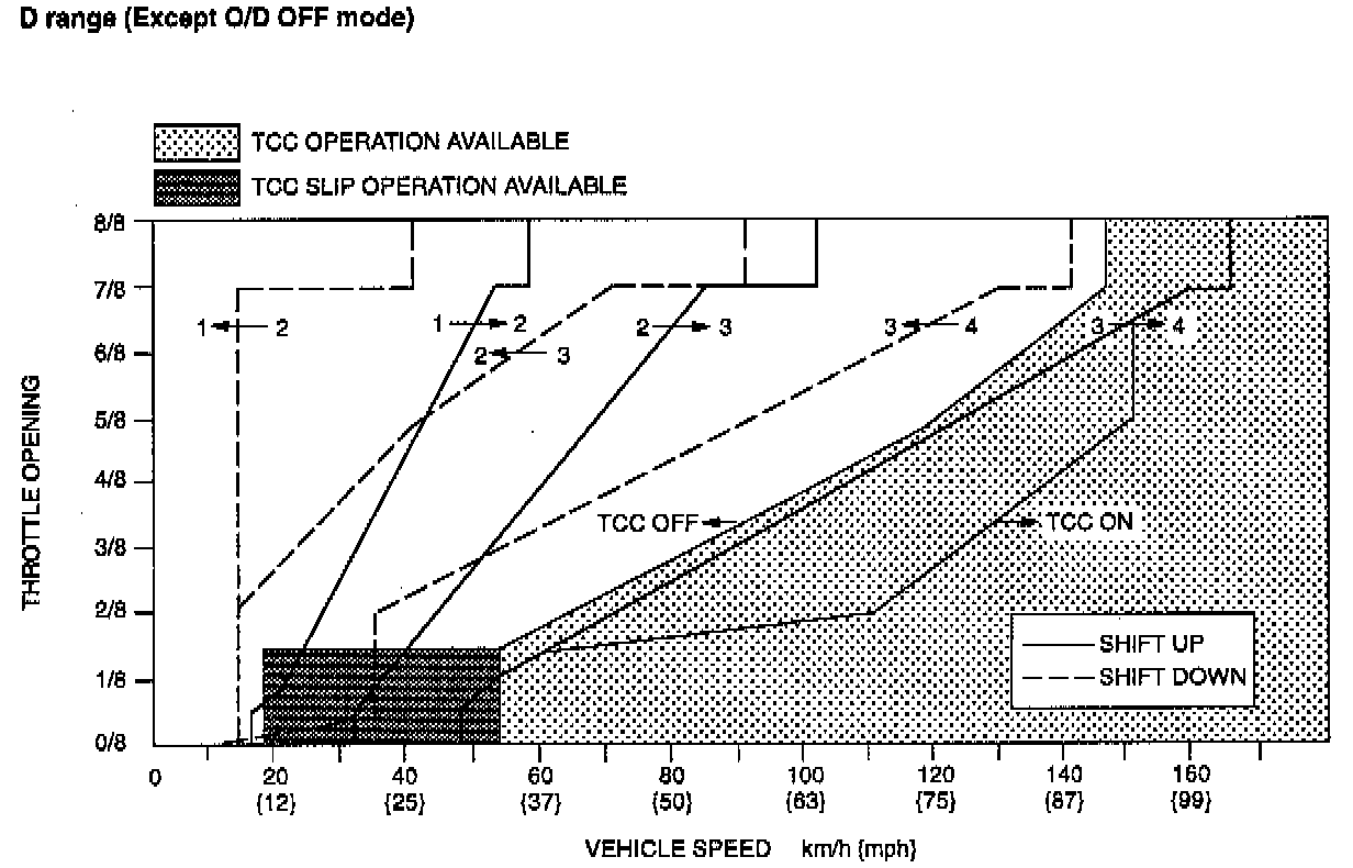 3. Verify that 1->2 and 2->3 upshifts and downshifts are obtained. The shift points must be as shown in the D range O/D OFF shift diagram.