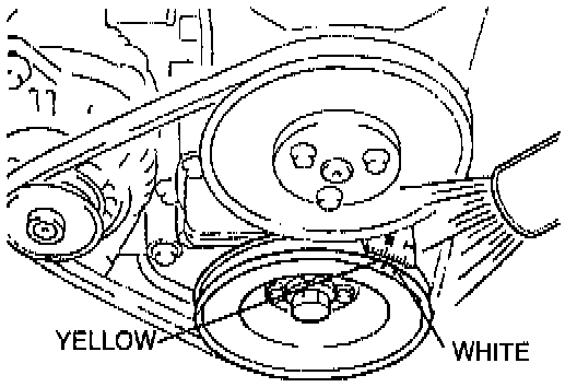 NOTE: The (yellow) timing mark on the crankshaft pulley should be close to the 10° (±1°) BTDC mark on the timing belt cover.
