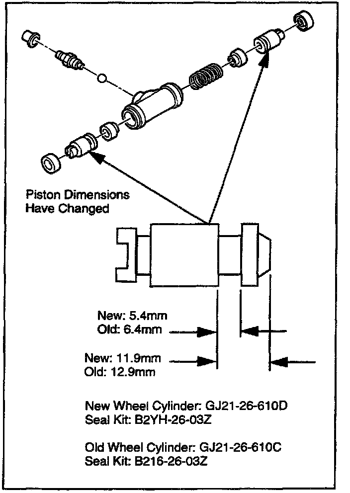 The wheel cylinder used for current models offers improved brake feel and can be used as replacement part for previous model years. Study this bulletin to determine the correct combination of new and used parts if repair is necessary.