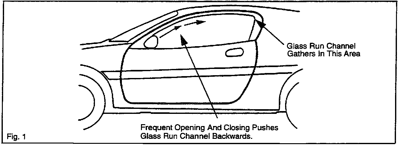 The glass run channel may become wrinkled after opening and closing the window repeatedly. This action causes the glass run channel to slide up the sash and gather at the top resulting in wrinkles or sagging in that area. To increase the holding strength of the glass run channel, the thickness of the channel's butyl tape has increased. Customers complaining of this concern should have the glass run channel replaced according to the instruction in this bulletin.