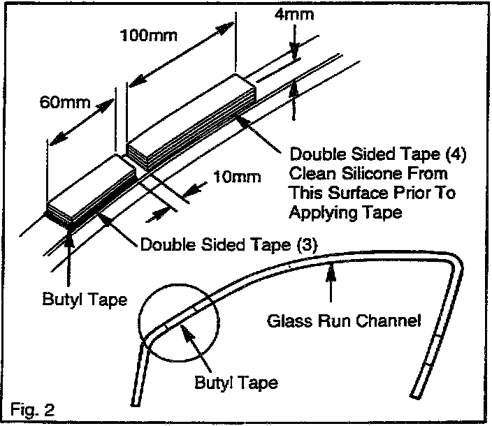 Tape should not exceed a total thickness of 4 mm. Silicone has been applied to the glass run channel. Degrease the area prior to applying tape.