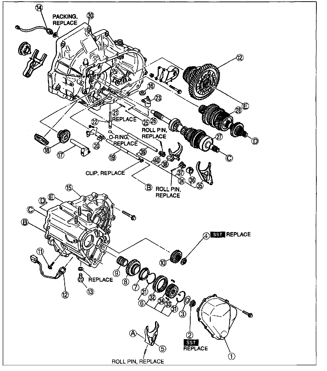 2. Remove the 3rd/4th clutch hub assembly, 3rd synchronizer ring, and 3rd gear by using the SST.