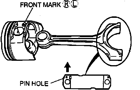 2. Assemble the piston and the connecting rod with the R or L mark and the connecting rod locating pin positioned upward as shown in Fig. 43.