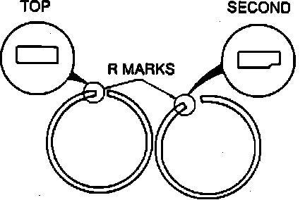 4. When installing the three piece oil rings, ensure both rails are expanded by the spacer tangs as shown in Fig. 44, and oil rings turn smoothly in both directions. The rings must be installed with the ``R'' marks upward. The second ring must be installed with the scraper face downward.