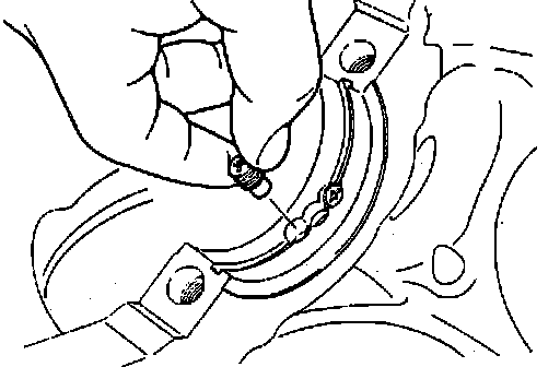 7. Remove any foreign material and oil from the journals and main bearings, then install the upper bearings and upper thrust bearings into cylinder block. The grooved main bearings are installed in the upper cylinder block. No. 4 bearing is wider than the other bearings.