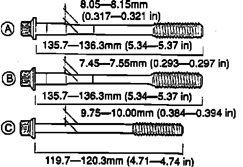 8. Measure the length of crankshaft cap bolts, Fig. 47. Maximum length on main bolts ``A and B'' is 5.45 inch, maximum length on sub bolts ``C'' is 4.76 inch, replace bolts if measurements exceed specifications. ``A'' bolts have a mark ``4'' on each bolt head, ``B'' bolts have a mark ``I'' on each bolt head.