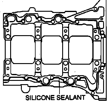 b. Apply a continuous bead of silicone sealant to the contact surface as shown in Fig. 48. The lower cylinder block must be secured within five minutes after sealant is applied.