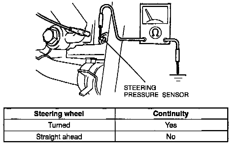 2. Start engine and check for sensor continuity with an ohmmeter. While turning, sensor should show continuity. With wheel in straight ahead position (not being turned), there should be no continuity.