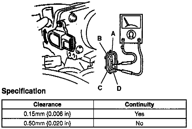 3. Insert 0.15 mm (0.006 in) feeler gauge between throttle stopper screw and throttle valve lever. Meter should show continuity.
