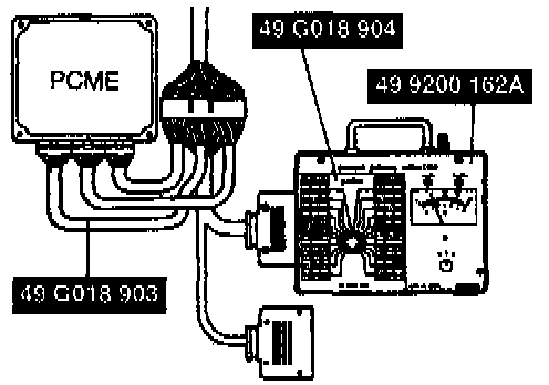 1. Remove the powertrain control module engine (PCME) and connect special service tools (Engine Signal Monitor and Adapter harness) to the PCME.