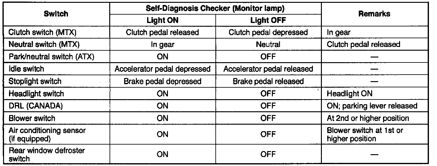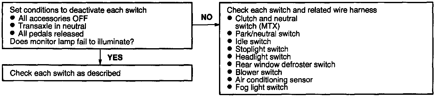 The TEN terminal of the data link connector must be grounded and the ignition switch turned to ON (engine off). If any switch remains activated, the monitor light will be illuminated. If switches are deactivated the monitor light should be OFF.