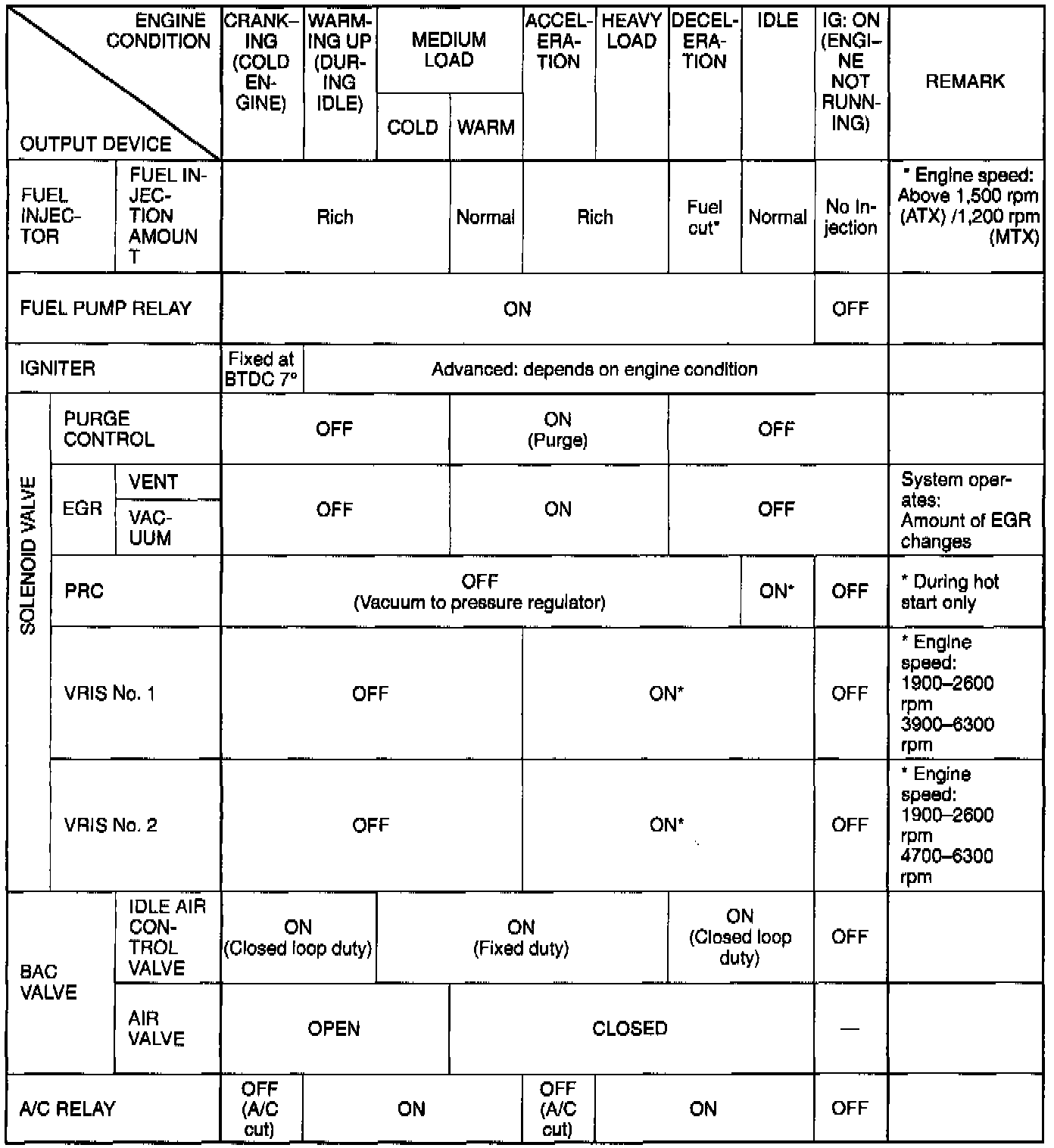 Engine Control Operation Chart: