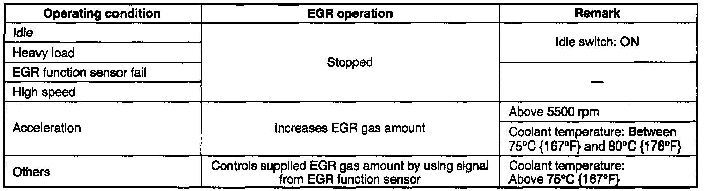 The two (duty cycle type) valves enable the PCME to make continuous EGR adjustments as required under a wide range of operating conditions. To improve driveability, EGR operation is canceled below coolant temperatures of 75°C (167°F). Warm engine operation is as described on the image chart.