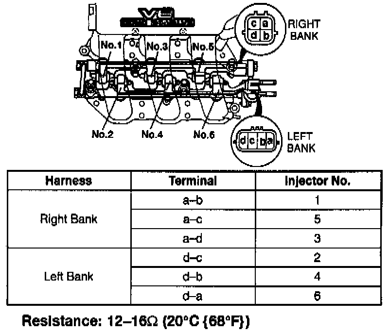 2. Measure resistance of fuel injectors between terminals shown on image chart.