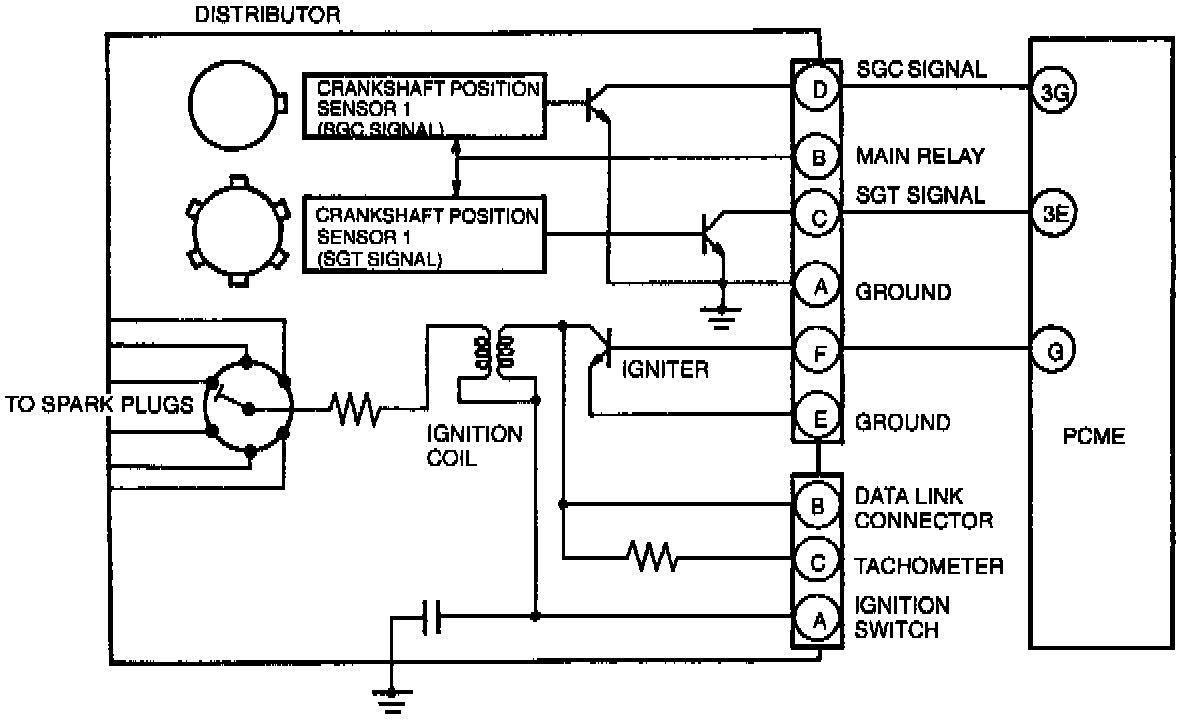 Crankshaft position sensor 1 provides PCME with signals regarding crank angle at 60° intervals (SGT signal) and #1 and #4 cylinders TDC (SGC signal). Together with other inputs, PCME calculates ignition timing over the range of vehicle operating conditions.